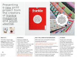 Newsagents selling Frankie should check out the Frankie gift paper book opportunity just announced by the publisher. This is a nice brand extension that stays true to the spirit of Frankie. This premium product shoud sell easily to your Frankie customers. It can be displayed with the magazine. Here is an excellent example of a publisher working with enwsagents, giving us the opportunity to decide for ourselves if we want to take on this product opportunity.