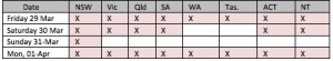 Here’s a table outlining the gazetted public holidays over the Easter weekend FYI. Click on the image for the detail. Fair Work Australia will confirm the accuracy of the information.