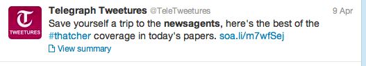 Save yourself a trip to the newsagent… ·April 12, 2013 ·Mark Fletcher ·0 Comments Check out this tweet telling people in the UK to get news about the passing of Margaret Thatcher online rather than by going to the local newsagents. 2 likes Media disruption Leave a Reply Cancel replyYour email address will not be published. Required fields are marked *Name * Email * Website Enter Code * Captcha Comment * Δ Post navigation Next ArticlePrevious Article