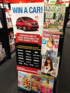 We are actively promoting the Win a Car promotion from Pacific Magazines with this aisle end display as well as in-location with the promoted titles.