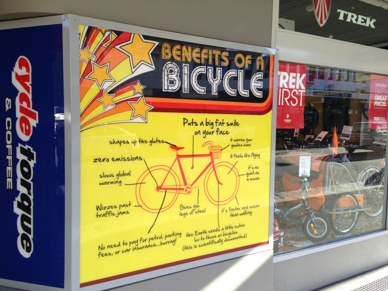 Check out the front window of a bike shop I saw in Launceston last week. The folks at Cycle Torque and Coffee in Launceston and promoting the many benefits of owning a bike to passers-by in the street. I think this is an excellent pitch. It certainly gets the benefits message in front of more people than they would otherwise if they only promoted this in-store.