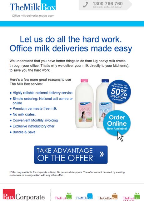 I love the professional and enticing promotion I received by email, from The Milk Box offering milk delivery to the office. Their pitch was simple and enticing. It makes using them to get milk for the office easy.