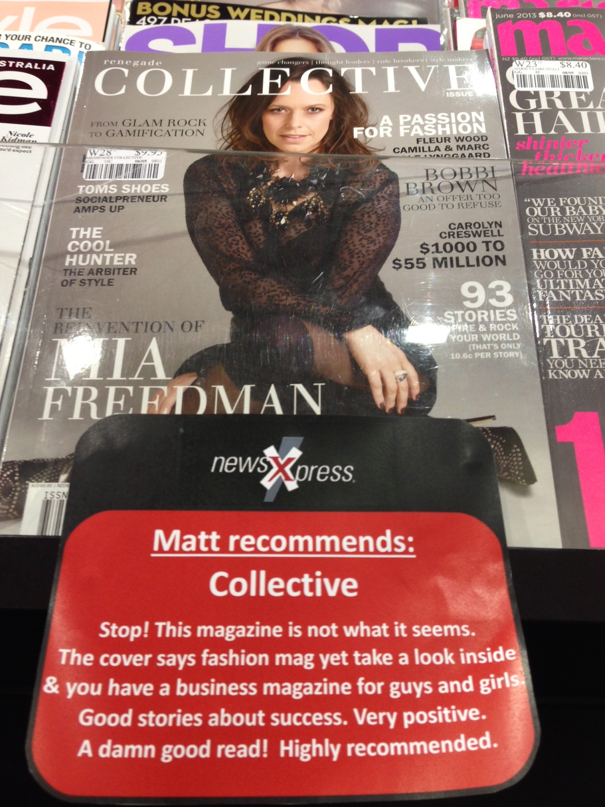 At any one time we have two or three titles we feature with a personal recommendation. the photo shows our latest recommendation – for new magazine renegade Collective. we chose this title as it needs help in being understood.
