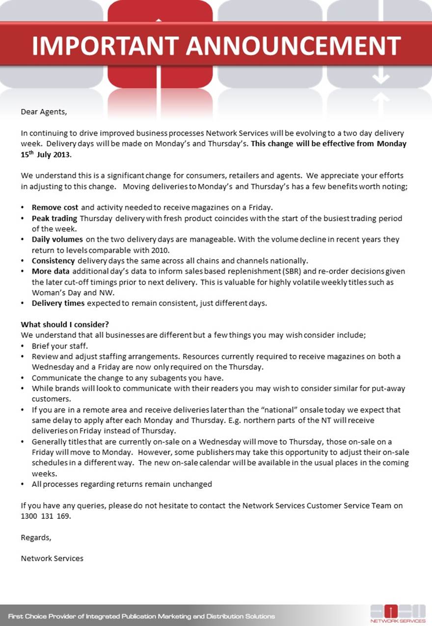 Magazine distributor Network Services has announced today it is moving to a Monday / Thursday magazine delivery roster.