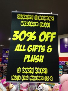 This year, we are pursuing a change in the Queen’s Birthday experience in one of my newsagencies. We are running a campaign of 30% off all gifts and plush.