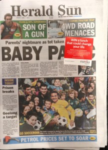 All the rules are gone now as the company scrambles to make as much money as it can from the declining sales of its print product. Case in point – yesterday’s Herald Sun. The headline of the day was covered by an ad for Eureka Report, a media outlet News owns.