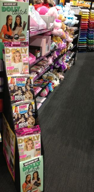 We are promoting the latest issue of Dolly magazine and the cool free clutch bag gift that comes with the magazine with this off-location display at the entrance to the aisle with our newspapers and placed facing onto the dance floor. This location places the magazine in front of more shoppers, many who would otherwise not see it.