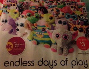 This line of bug-eyed plush items being promoted by mass merchant K-Mart look surprising like a line we have been selling with tremendous success for more than a year. Their price point is very low. It matches the quality of the product.