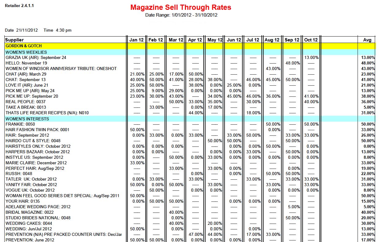 Using industry standard calculations, a Magazine Sell Through Rates Report identifies the titles that are failing to meet minimum performance levels.
