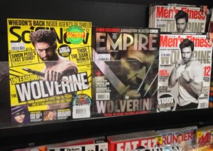 We have three unlikely magazines next to each other thanks to their covers featuring Hugh Jackman and his new Wolverine movie. SciFoNOW, EMPIRE and Men’s Fitness look good next to each other in this simple full face display.