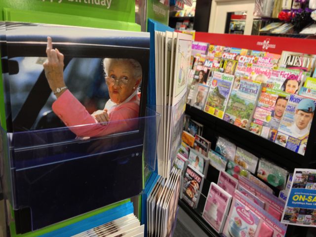 We move the Spirit humor stand around the store every few weeks. Right now it’s located in front of our magazine department where it is attracting more shoppers to our magazine department. I’d encourage other newsagents with the stand to try this placement. You’ll see upside in Spirit card sales as well as upside in magazine sales.