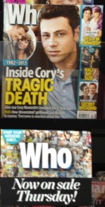 Our Who sales have been excellent from Thursday through the weekend. The interest in the Cory Monteith cover story has been considerable. I noticed the title being purchased by younger than usual customers. We made the most of the opportunity with placement on the lease line and deeper in-store. We need to be opportunistic with stories like this.