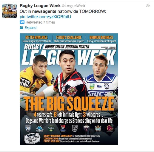 30,292 Twitter followers got a tweet yesterday promoting the latest issue of Rugby League Week which newsagents have in-store form today.