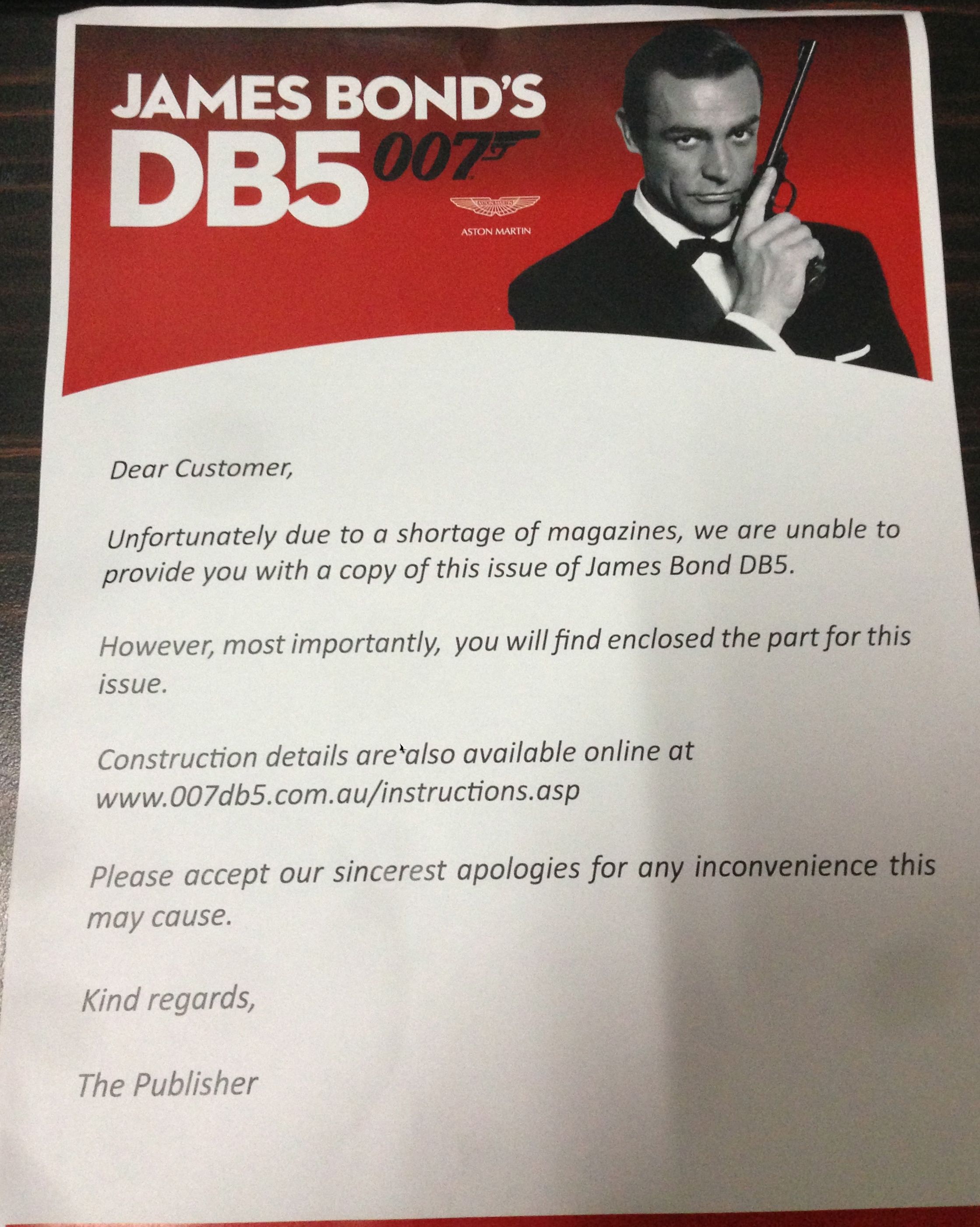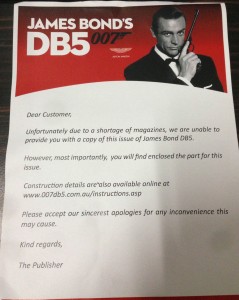Check out the letter provided by the publisher for part 65 of the loved James Bond DB5 partwork collection. The publisher says they have run out of magazines! Seriously! The publisher has run out of magazines.