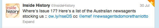 The publisher of Inside History magazine has tweeted their 3,231 twitter followers promoting the magazine and newsagents as the go to retailers and provided a link providing details on newsagents carrying the title. This type of support for newsagents is excellent.