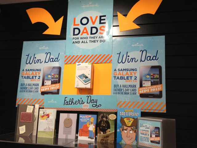 The Win a Samsung Galaxy Tab 2 competition from Hallmark for Father’s Day is popular and it’s only been running for a day. One of our customers will win this tablet and we’re promoting this by showing off the actual unit they will win – it’s the centrepiece of the display.