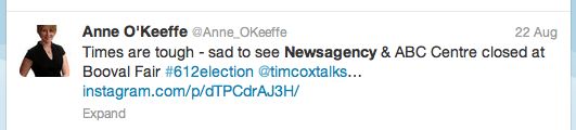 In an example of social media chronicling more than we’re used to from traditional media, Anne O’Keeffe a producer for ABC radio in Brisbane posted on Twitter about the closure of Nextra Booval Fair. Accompanying her tweet was a photo of the closed newsagency.