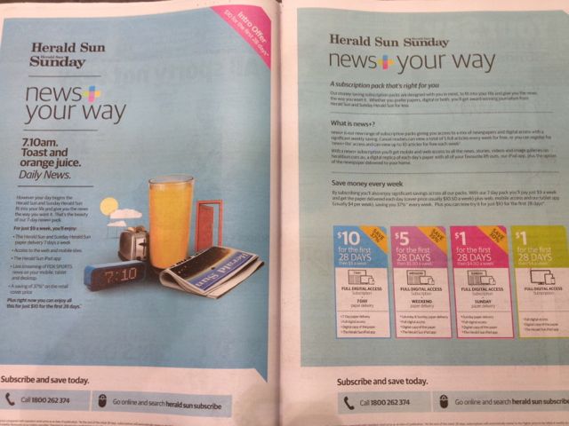 Check out the two-page spread in the Herald Sun yesterday, promoting their print and digital offering. It’s a deal I suspect is more about the digital sub.