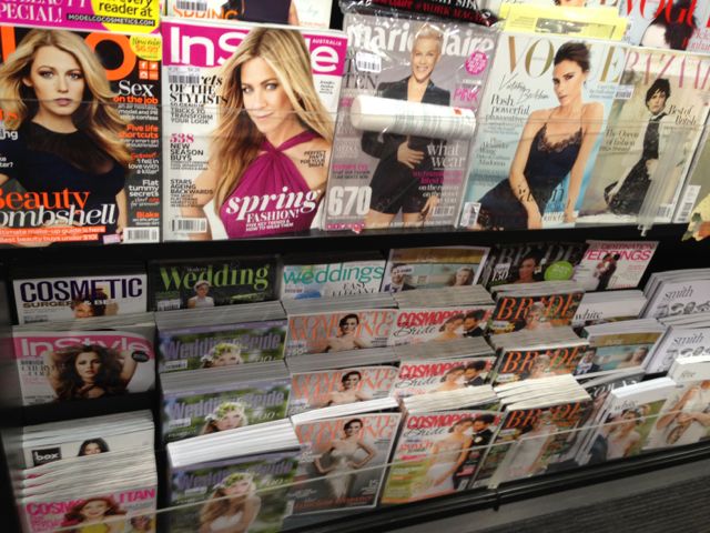 As part of our perpetual magazine relay – we love change – I moved wedding titles on Saturday, placing them below magazines for women (teens through thirty or so). While one has to reach down to pick up a magazine here – it places the titles closer to where the target shopper.