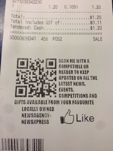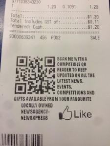 The team-lead in one of my newsagencies is promoting the business Facebook page with this QR code on the bottom of customer receipts. It’s another way of reaching out to customers – to create a stronger connection.