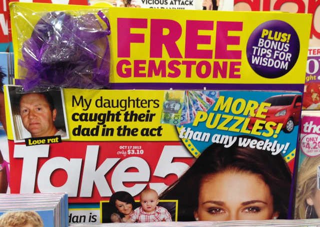 No free gemstone gift with my Take 5’s.What I did get is a price rise to $3.10 which I didn’t click to till I’d sold half a dozen. No flyer with the mag’s and unless I missed it no mention of a price rise in the network news emails. I didn’t know but Pacific Mags knew, the That’s life now has “Still Only $3.10” on the cover this week,an obvious dig at the “Still Only $3.00” Take 5 has been running since That’s life went to $3.10 months ago.