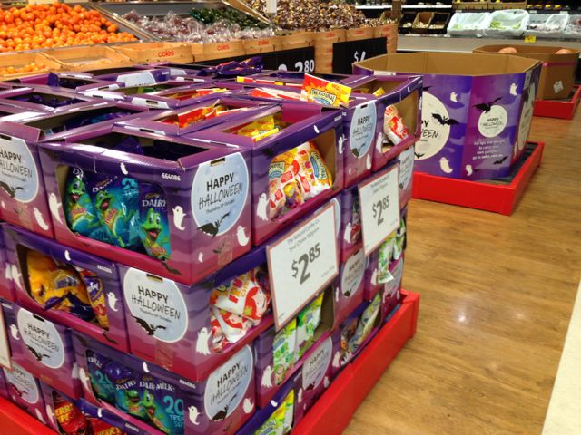 At a Coles supermarket in Melbourne yesterday – a pallet of Halloween candy at the entrance to the business and in the background a near empty pallet of Halloween pumpkins. I’ve not seen any Australian retailer do pumpkins like they do in the US before.