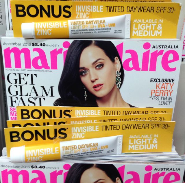 The free Invisible Zinc gift with the latest issue of marie claire is another excellent gift with purchase in-store right now. The yellow card and the Zinc stand out when next to the pink of the magazine’s masthead. This is another title to promote in a second location to maximise the value of the gift.
