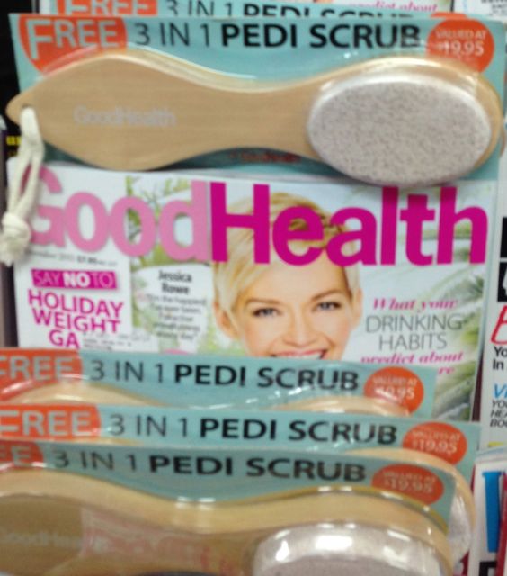 The free pedi scrub with the latest issue of Good Health magazine is a terrific gift for this title. It looks and feels substantial. Too often gifts with magazines are insubstantial. This gift is far from that and should drive excellent sales for this issue. It’s an issue to promote in a secondary location where those not looking for the title will see it.