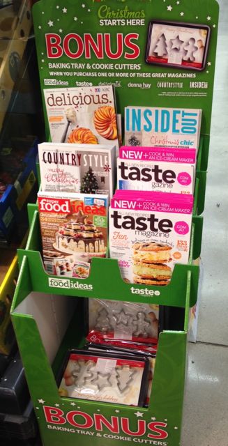Check out the premium floor display unit promoting a range of magazines in Woolworths supermarkets at the moment. It’s a stunning unit promoting the bonus gift with purchase – a much better unit than this publisher provides newsagents …very frustrating.