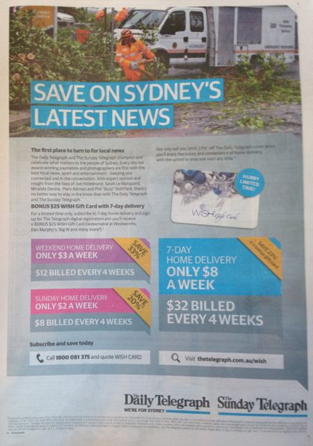 News Corp. and Fairfax are pushing subscriptions hard. Here is the full page ad in The Daily Telegraph yesterday.