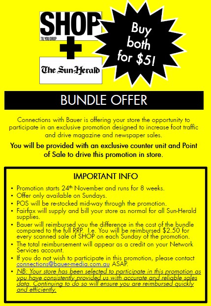 Bauer and Fairfax were scrambling last week to sort out the mechanics of an offer promoting Shop Til You Drop and the Sun Herald newspaper – the bundle is priced at $5. Key stakeholders had not been informed and had to work through processes to ensure that the offer could run as proposed.