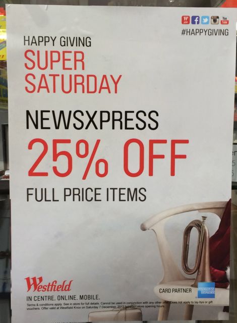 Saturday morning we discovered Westfield didn’t follow our request, they were promoting us offering 25% off everything in-store – not just gifts as we indicated. The poster, catalogue and other materials were all wrong. Someone from centre management visited after we contacted them but he offered no solution or compensation for the mistake by Westfield.