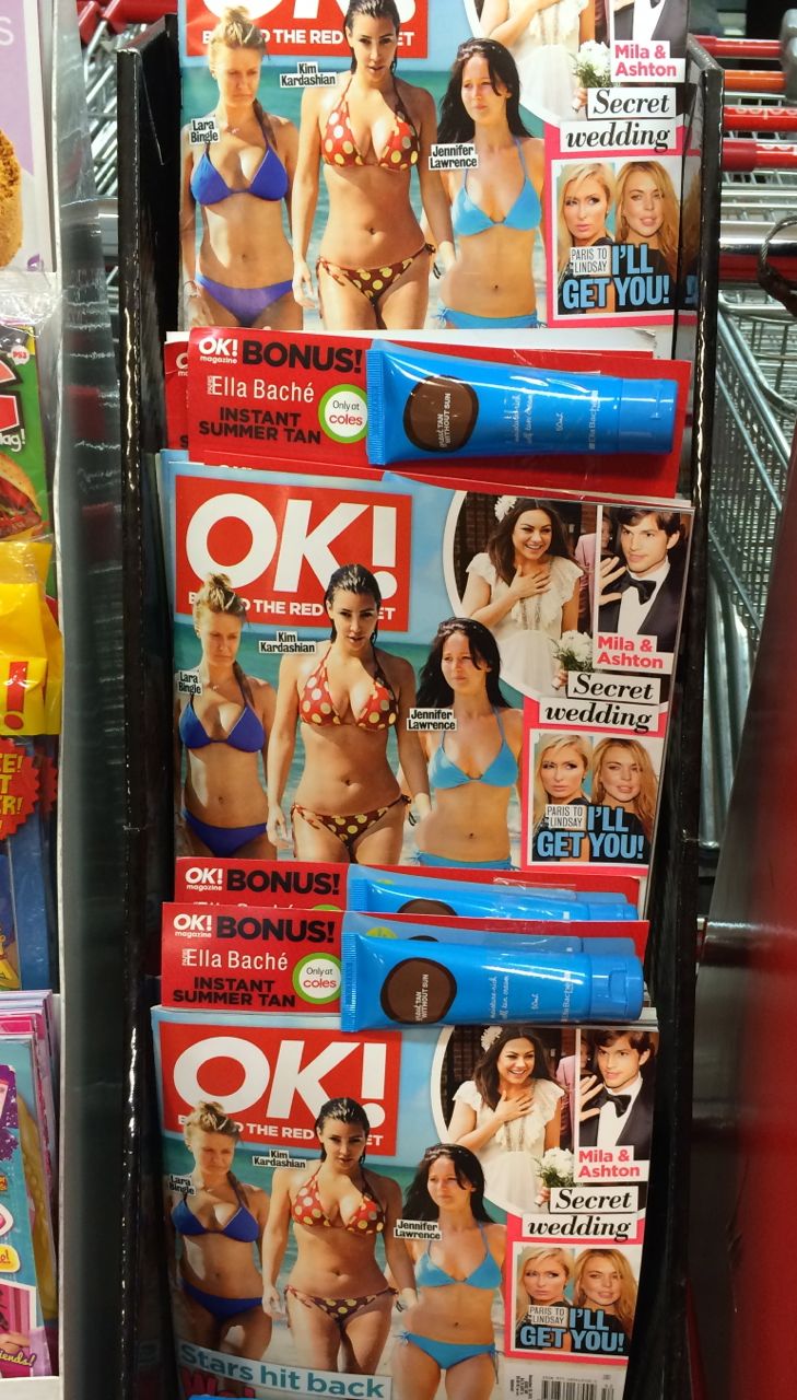The card holding the free gift of Ella Baché instant summer tan in the current issue of OK! magazine at Coles says Only at Coles. While I understand the importance of different channels offering gifts with purchase at different times, promoting a gift as only at Coles on the magazine is not ideal. I don’t recall a gift with purchase being promoted or ow with the title like this as only at newsagents.