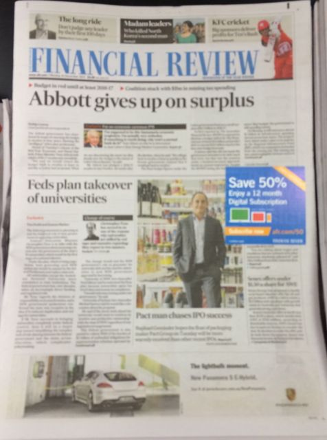 AFR front page cover-up ·December 17, 2013 ·Mark Fletcher ·0 Comments Editorial content on the front cover of The Australian Financial Review today was partially covered with a house ad for their digital product. Recent sales declines push the AFR closer to being a digital only product. Ads like this ‘help’. 3 likes newspaper masthead desecration Leave a Reply Cancel replyYour email address will not be published. Required fields are marked *Name * Email * Website Enter Code * Captcha Comment * Δ Post navigation Next ArticlePrevious Article