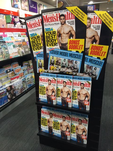 We’re promoting the latest issue of Men’s Health magazine in our men’s reading area with this aisle end display. We’re also pitching the title as an ideal Christmas gift for a guy as part of a group of titles elsewhere in the store. Plus we have it in its usual location.