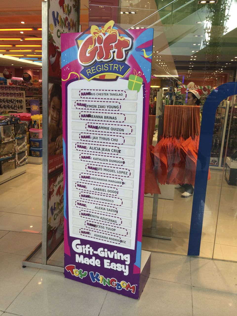 I was reminded of the gift registry idea when in Manila early last month and I saw a gift registry promoted out the front of Toy Kingdom at the Mall of Asia. Their pull-up banner not only promoted the registries for individuals, it also promoted the service itself. Very smart.