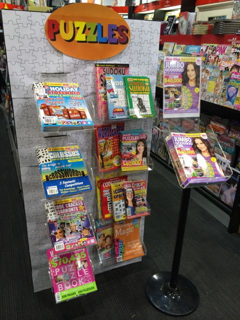 With a surge in holiday travelling we are seeing many new faces. Our team has been leveraging this opportunity with this excellent aisle end display promoting puzzle titles. I was thrilled to walk into the shop and see the initiative they had taken – inncluding the crossword art backdrop and the eye-catching sign. This display is placed at the entrance on the right to our main magazine aisle and on the left to plush and newspapers.