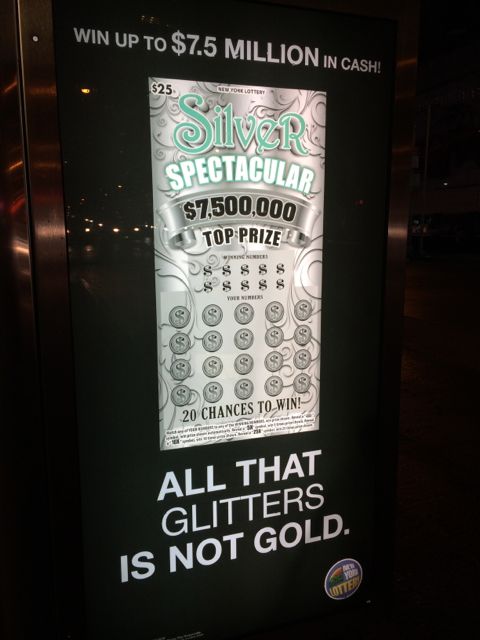 Here in New York these posters are everywhere on the street promoting the Silver Spectacular scratch lottery ticket game. First prize is US$7.5 million. That’s a nice prize for a scratch ticket game. Tickets cost $25 and I’m told they are selling well.