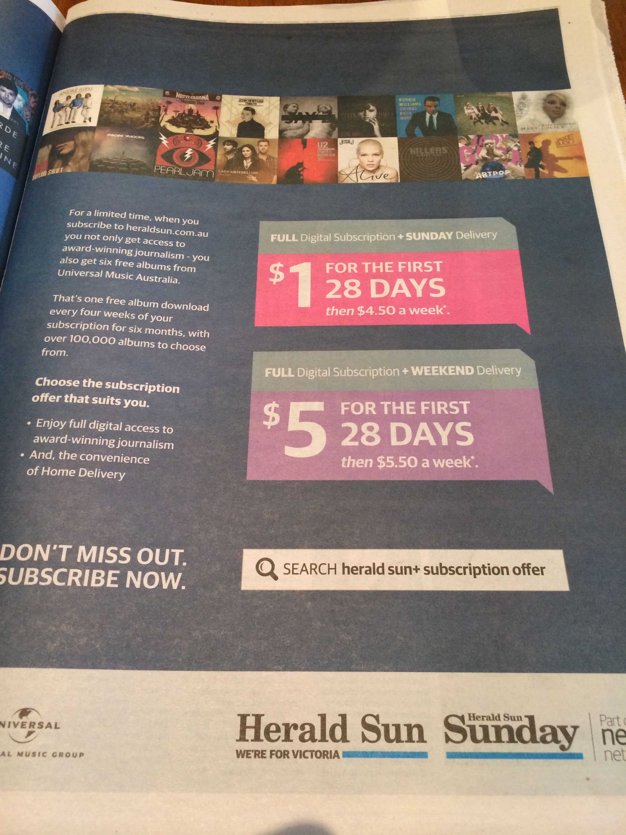 The relentless full-page and double-page ads in News Corp. capital city newspapers promoting digital access with one or two day home delivery are an indicator of the plans of the company. The marketing reads as if the print product is the gift with purchase for the main item – the digital subscription.