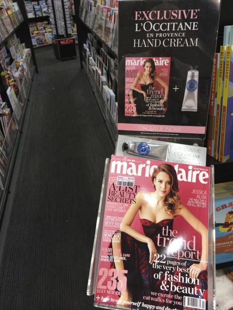 We also have this title in a half-waterfall display and featured at the counter as magazine of the week – supporting the premium value L’Occtaine hand cream gift with purchase.