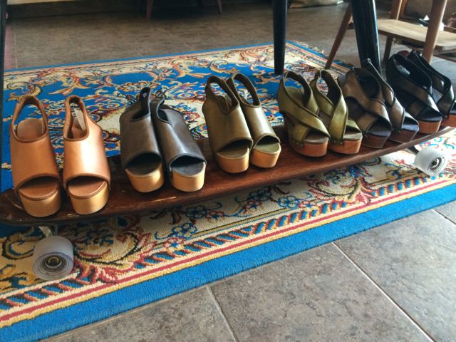 A retail store near a holiday destination uses a skateboard as a prop for displaying shoes. this is excellent visual merchandising. The skateboard speaks to their target shopper better than if the shoes were placed on a traditional shelf.