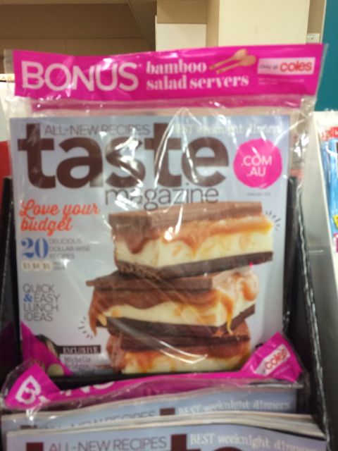 People purchasing Taste magazine at Coles get a set of bamboo salad servers. I’m not so sure it will affect our sales since the magazine looks better in newsagencies un-bagged than it does in Coles. The gift is good but not great. My only frustration is the notice on the bag that the gift is exclusive to Coles.