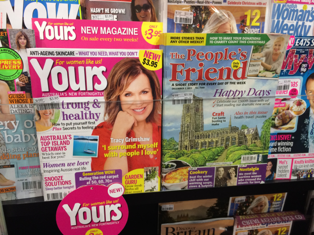 Comparing it to the cheap and cheerful UK weeklies chasing the same reader, the Aussie Yours feels right at home. The difference here is that we don’t have a section of titles except for the imported UK titles. Yours feels more like them than an Aussie title. It being placed with the UK titles may not help it find the Aussie customer. I wonder if Yours would be more successful over time if it was not the only Australian magazine in this space. I think for these reasons it is important we promote it with our regular weeklies as well as UK titles – to get both shoppers.