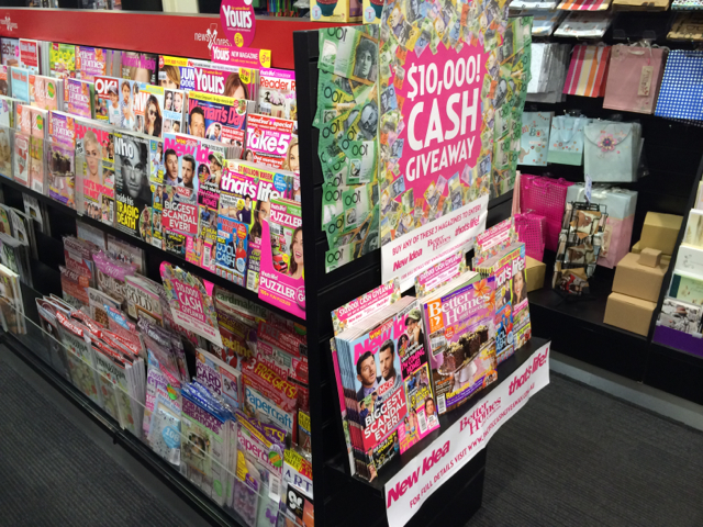 Here is our aisle-end promotion for the Pacific Magazines $10,000 competition. It’s satisfying seeing customers notice the display, stop, and pick up a title. While I am not a fan of billboard displays in-store, this one works because of terrific collateral supporting a simple pitch.