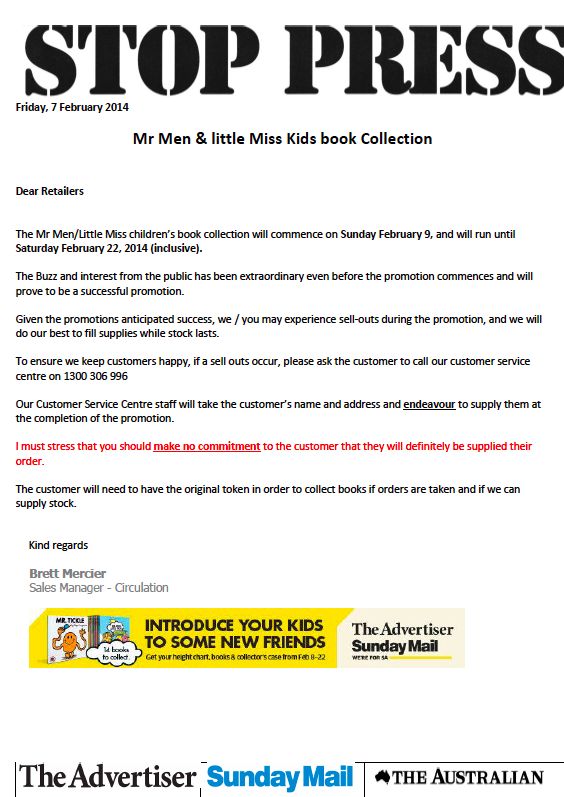 News is heavily promoting the Mr Men books in its newspapers and on national TV. It would / should have known the success the campaign could achieve and should have ensured sufficient supply in South Australia. Thankfully, I am not experiencing short supply in Victoria.