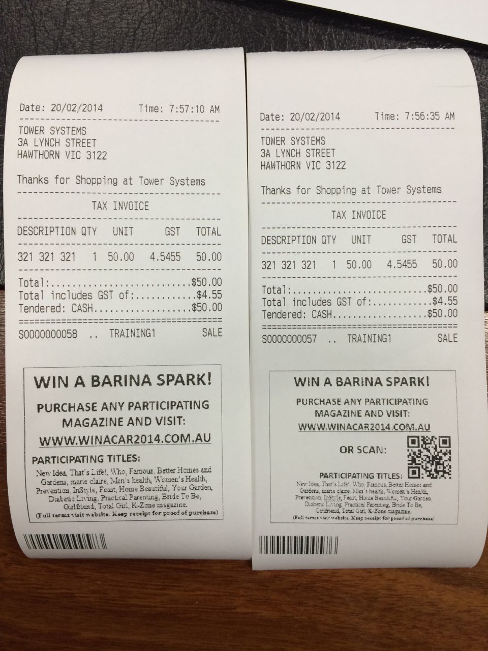 My newsagency software company is helping newsagents promote the WIN A CAR campaign with coupons on receipts. The image shows two examples.