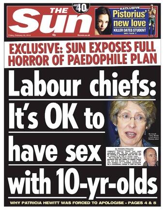 I’d refuse to sell this edition of The Sun newspaper if I was a newsagent in the UK. The headline suggests that the chiefs of the British Labour Party say it’s okay to have sex with 10 year olds.