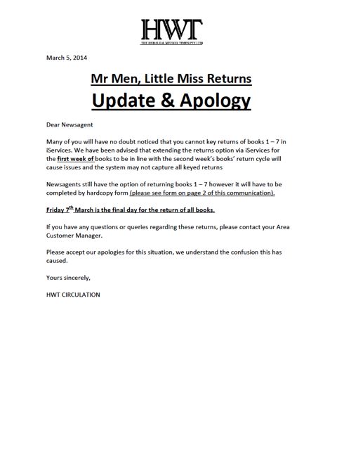 News Corp’s Herald & Weekly Times division issued an apology to newsagents about returns issues with the Mr Men books. It appears the company’s software platform will not allow returns to be done the way the company intended. They have requested manual returns in a letter to distribution newsagents. While News Corp has excuses for this and for the lack of top up stock where there have been sell-outs, and there have been plenty, it keeps having problems like this with promotions and opportunities where the resolution is for newsagents to spend more time. As one newsagent pointed out this week: this is 2014, not 1974. News Corp needs to adopt current practices.