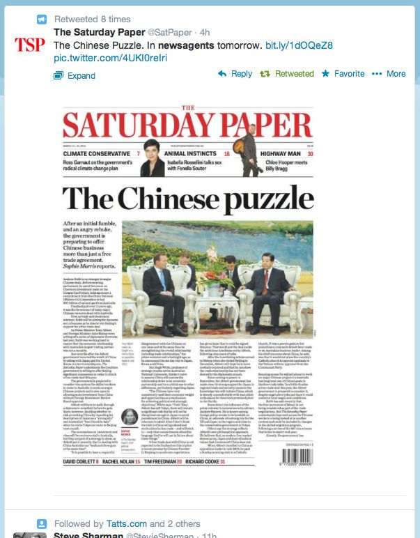 The publisher of The Saturday Paper has used Twitter to promote tomorrow’s edition and newsagents as the go to retailers for this to their 7,979 Twitter followers.