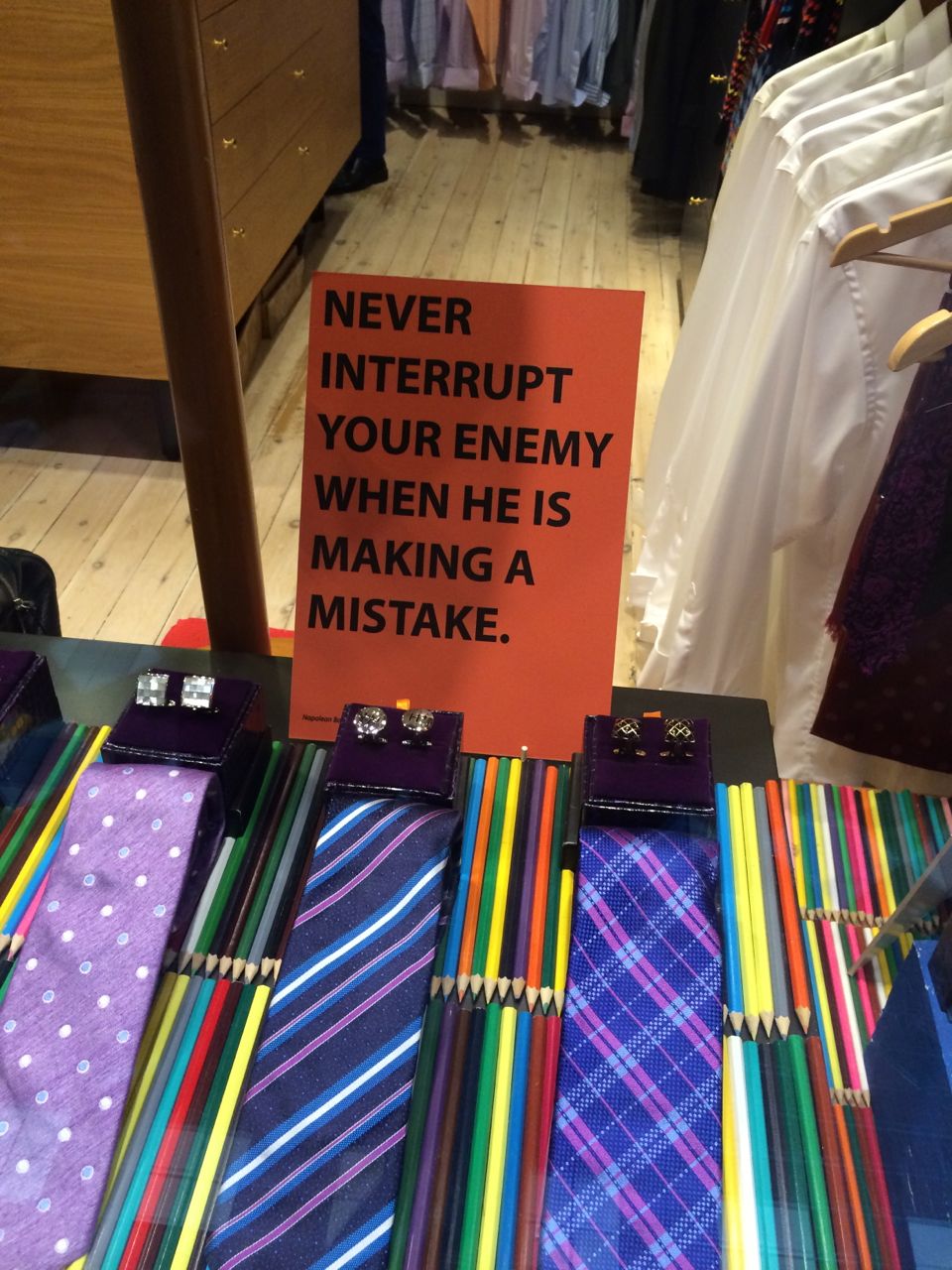 There were four signs like this in the window. Each with text unrelated to the products being sold but related in that the statements were complex, interesting like the menswear products being sold.